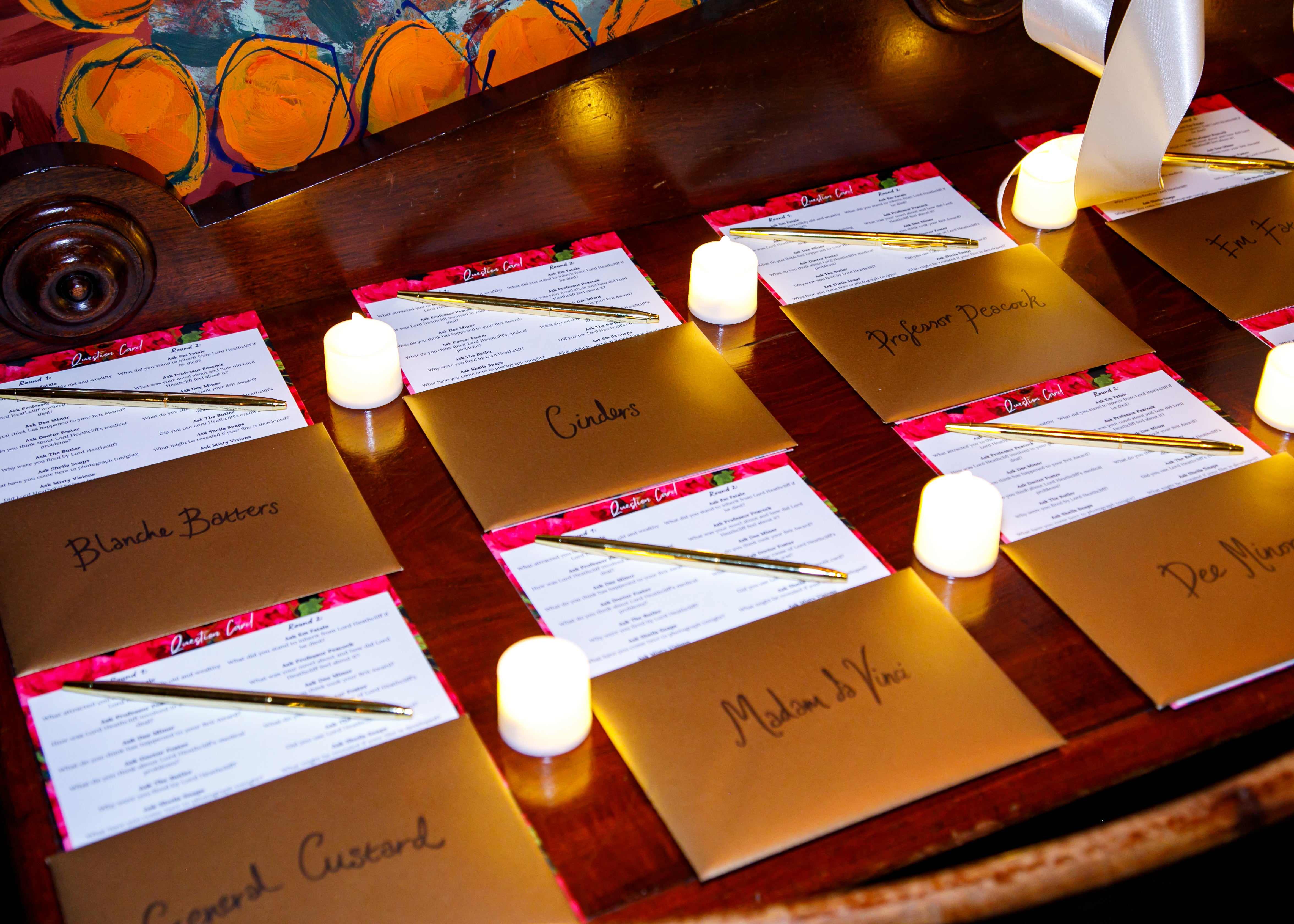 Next, alongside some character background cards, there was an intriguing item which gave an additional clue as to who their character might be. While one guest might have received a feather duster or a deck of tarot cards, another could have found themselves equipped with a pair of handcuffs or an artist’s palette!