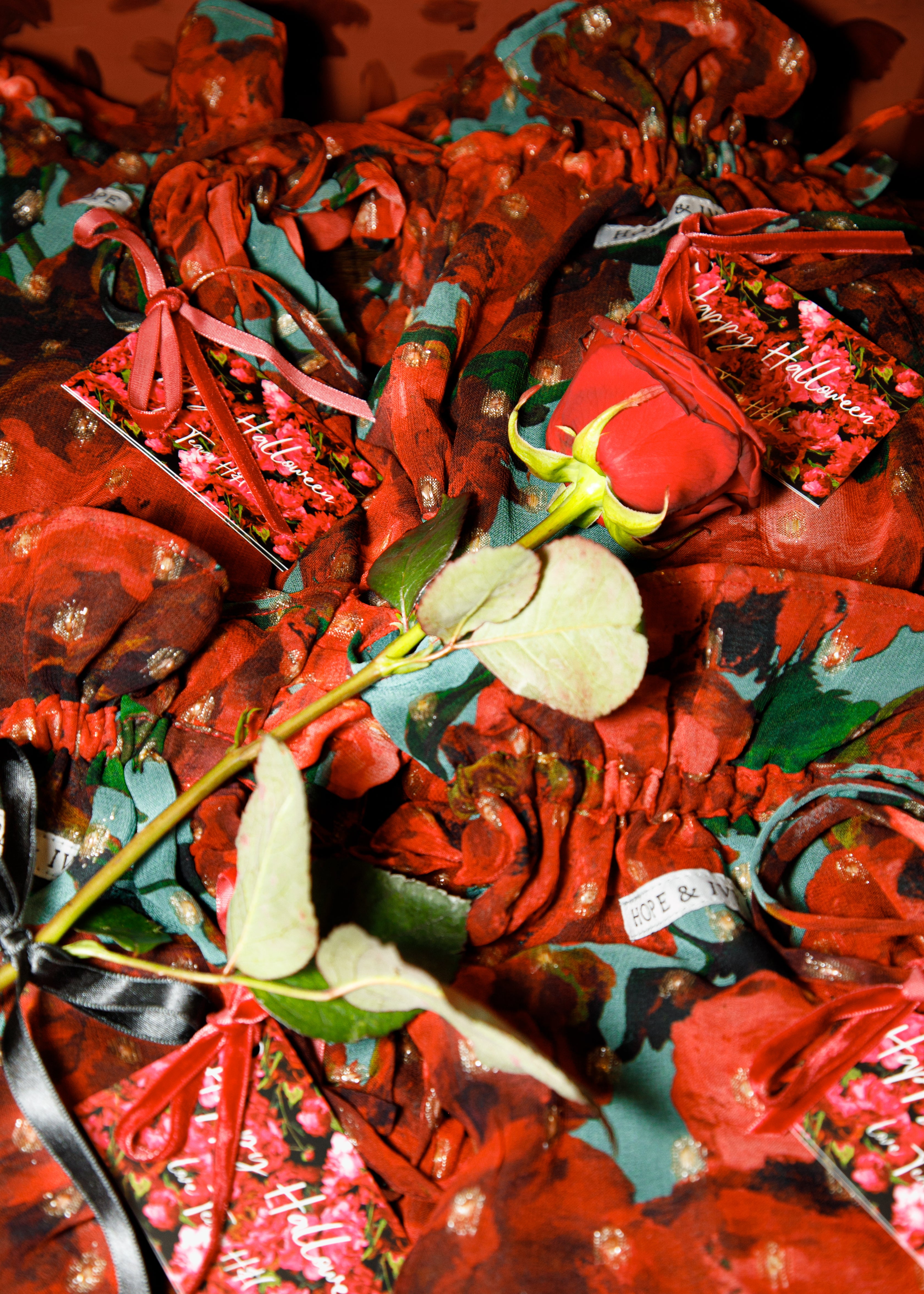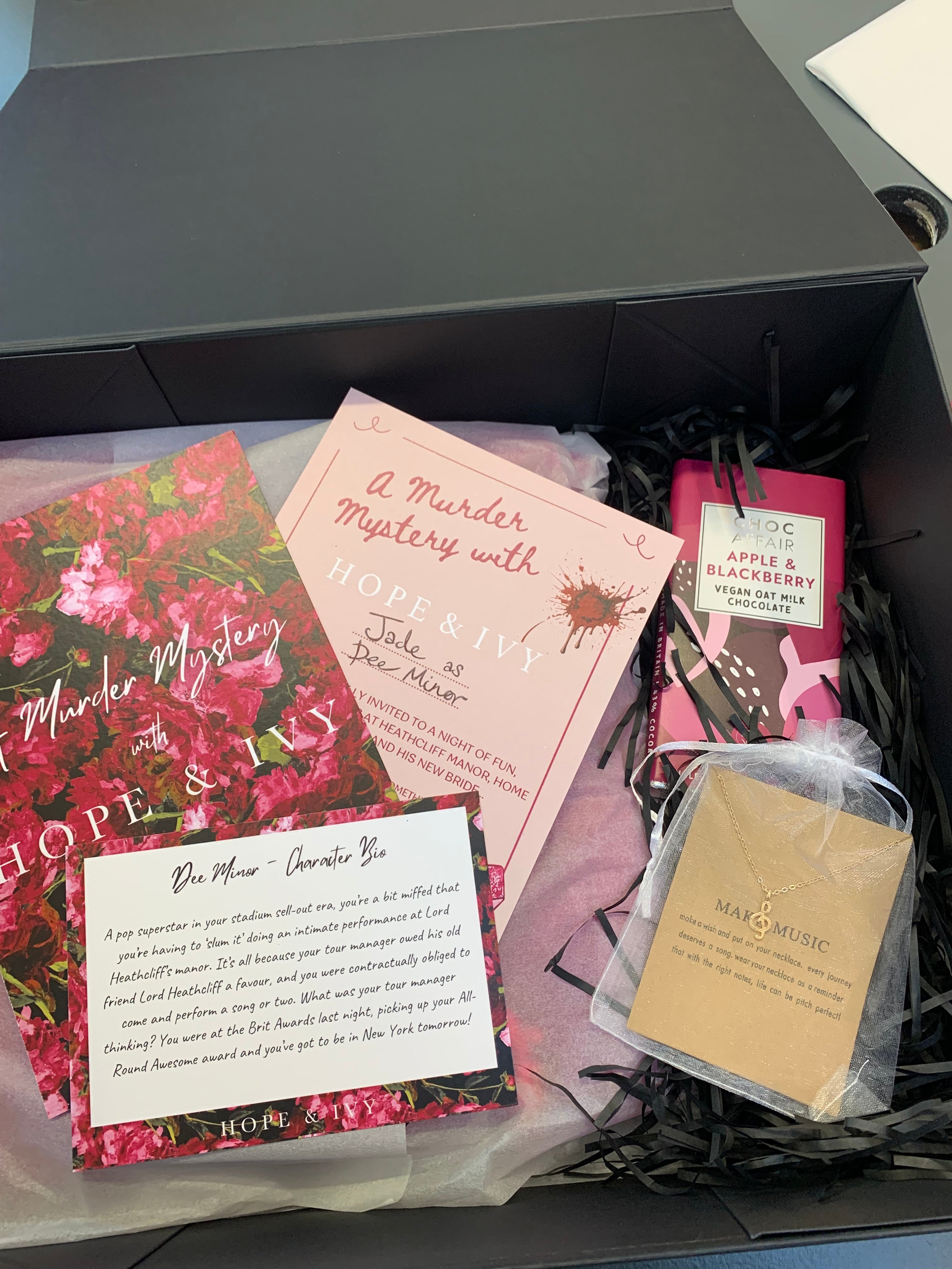Before the event, all our lucky attendees were sent a mysterious black box tied with a plush red velvet ribbon. And what was inside? Well, it wouldn’t be a murder mystery without costumes! But since this is a Hope & Ivy Halloween, we made sure our guests were set to dazzle in gorgeous dresses from our AW24 collection.