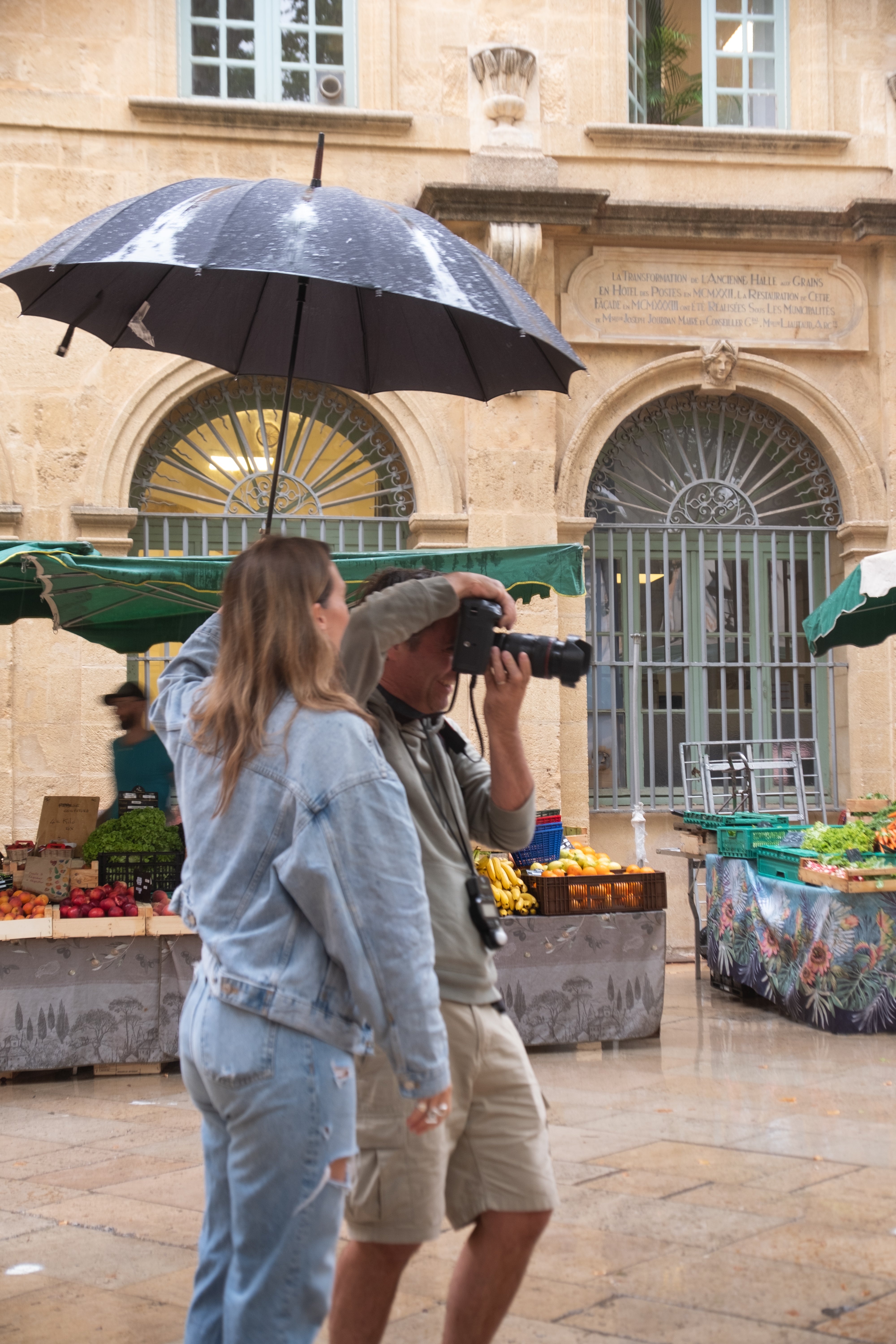 John suggested that the bustling flower and fruit markets of Aix-en-Provence's old town would provide a touch of cover from the rain and wonderfully romantic surroundings, so bright and early the next morning, that’s where we headed. With the gorgeous Jenna as our model, it was a full team effort to keep both her and John dry as they worked, with Lucy opting to use a light reflector as a makeshift umbrella!