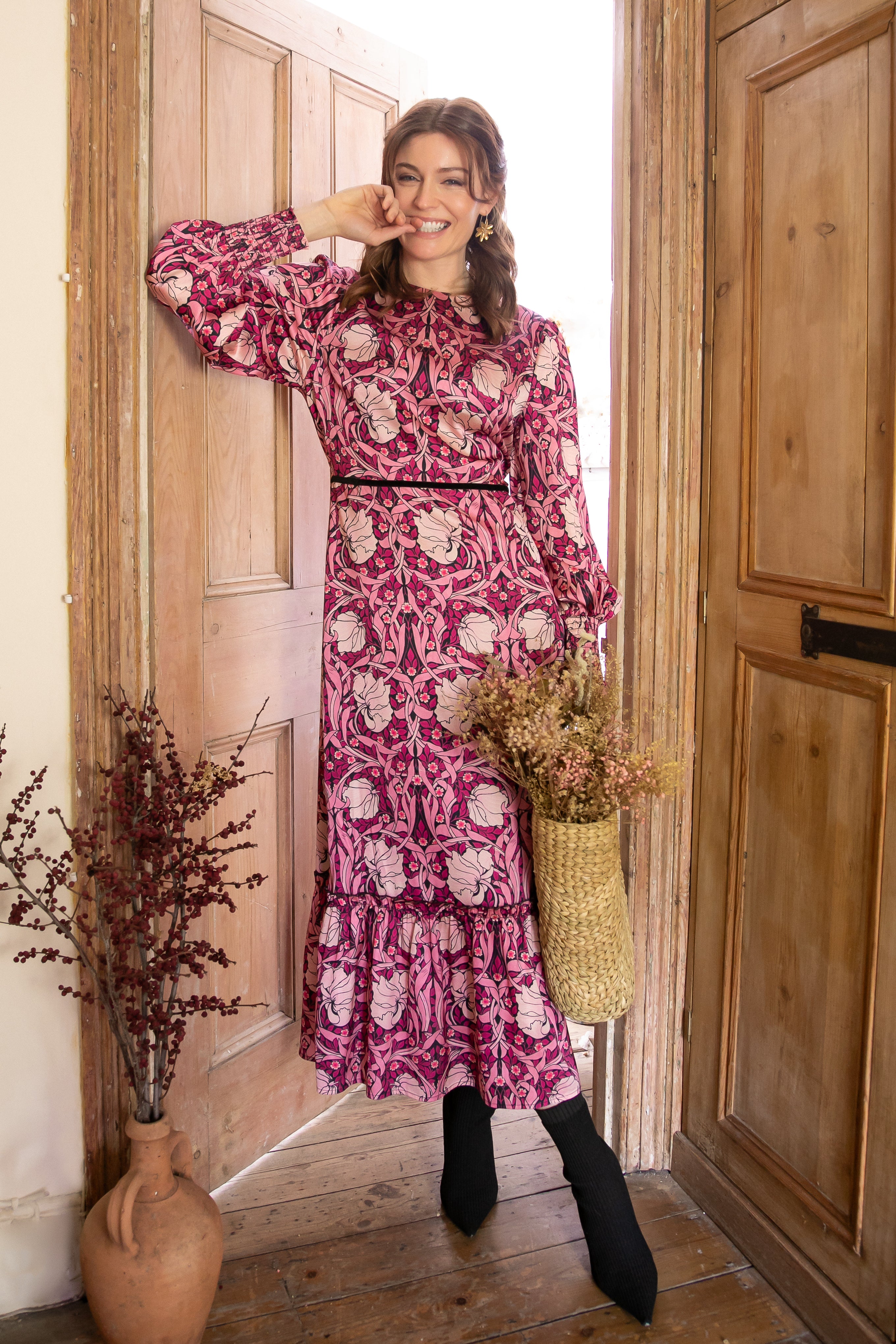 We love William Morris’s iconic Pimpernel print so much that we’ve used it in different colourways across four of the dresses in our collaborative collection. A classic repeated floral that’s typical of Morris, it was created in 1876 during one of his most prolific periods of wallpaper production– when the loose spontaneity of his earlier patterns gave way to a strong symmetrical formality.
