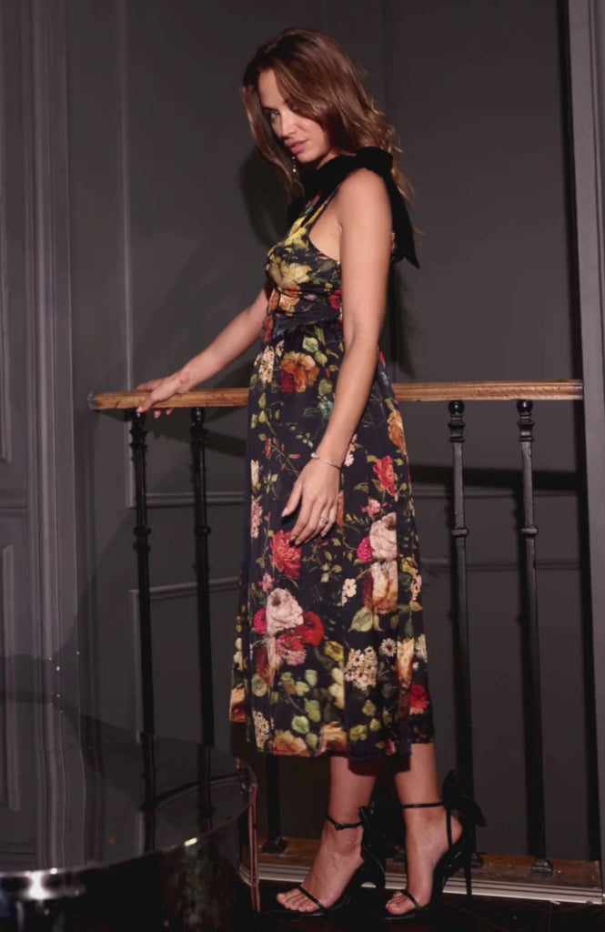 If you’re on the hunt for the ultimate special occasion dress, we’ve got just the one... meet The Esmerelda. Finished with beautiful velvet bows at each shoulder, this v-neck midi dress comes complete with a figure-enhancing corset bodice and a delicately feminine, hand-painted print. Snap her up for your winter wedding guest dress requirements or add a little sparkle for a dreamy Christmas party outfit.