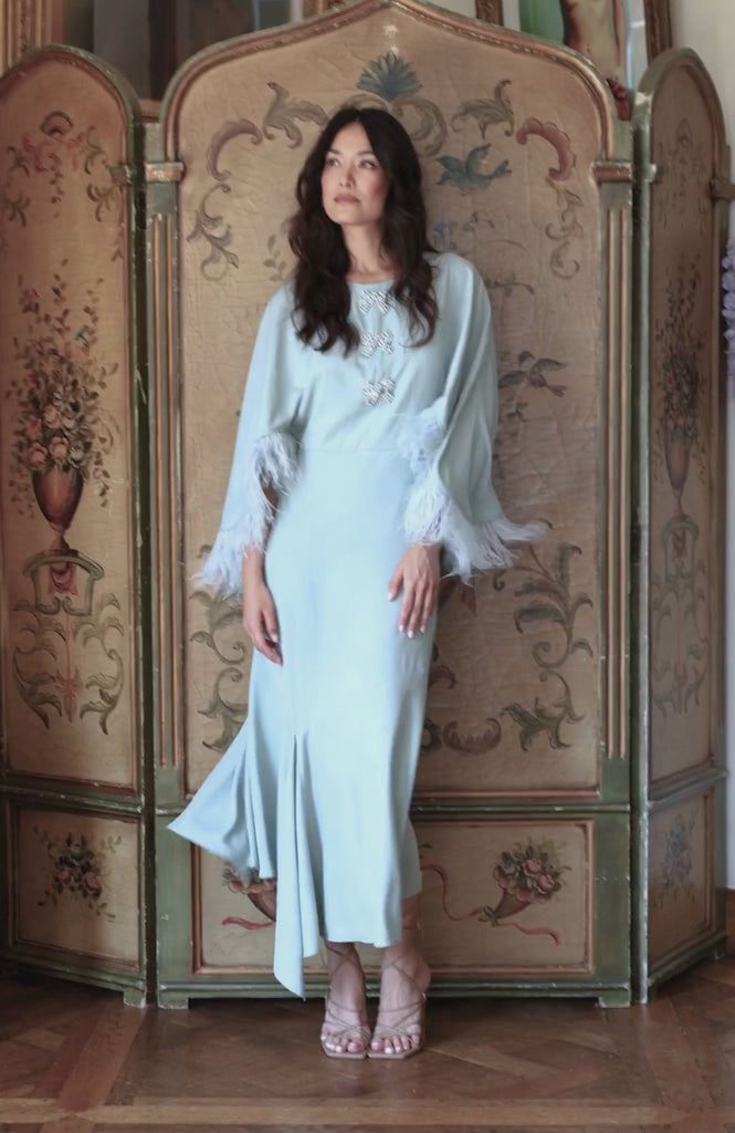 The Lucia Feather Trim Flutter Sleeve Midi Dress with Embellished Bow